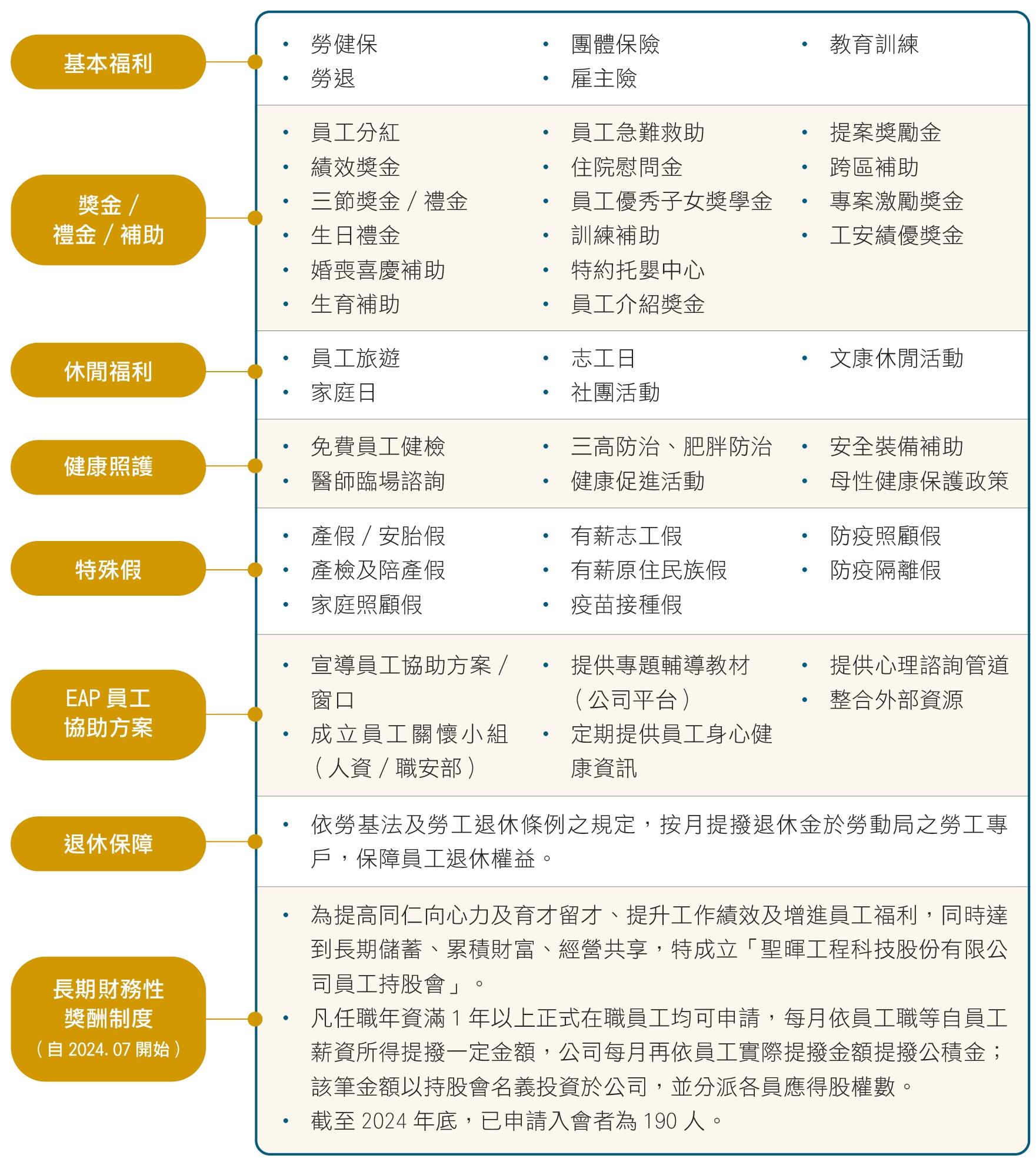 聖暉重視員工福祉,關注員工身心健康,我們建立各項優於法規福利及財務獎酬制度,期望達到人才長期留任之效益。此外,不定期舉辦各類社團與休閒活動,促進同仁交流、增進團隊凝聚力,營造互助與活力並存企業文化。