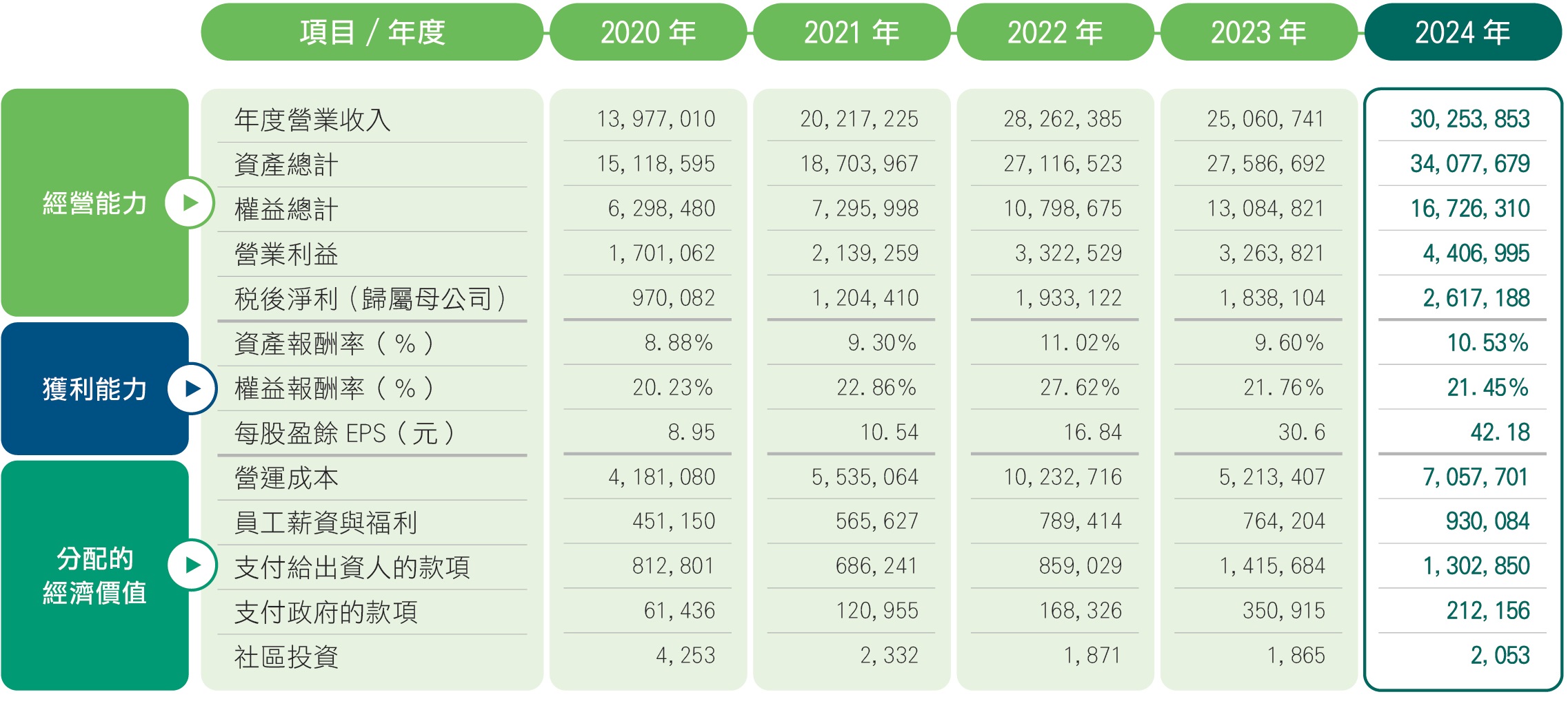 聖暉長期深耕本業,擁有穩健的財務結構。我們重視股東及投資人意見與溝通,致力於提升利害關係人價值;定期揭露即時財務績效,以嚴謹透明之紀律,創造穩固的經濟價值回饋予利害關係人。2024年聖暉合併營收為新台幣302.5億元,歸屬於母公司業主淨利為26.1億元,每股稅後盈餘(EPS)以每股面額 10 元還原計算相當於42.18元,再度創下優越成果。