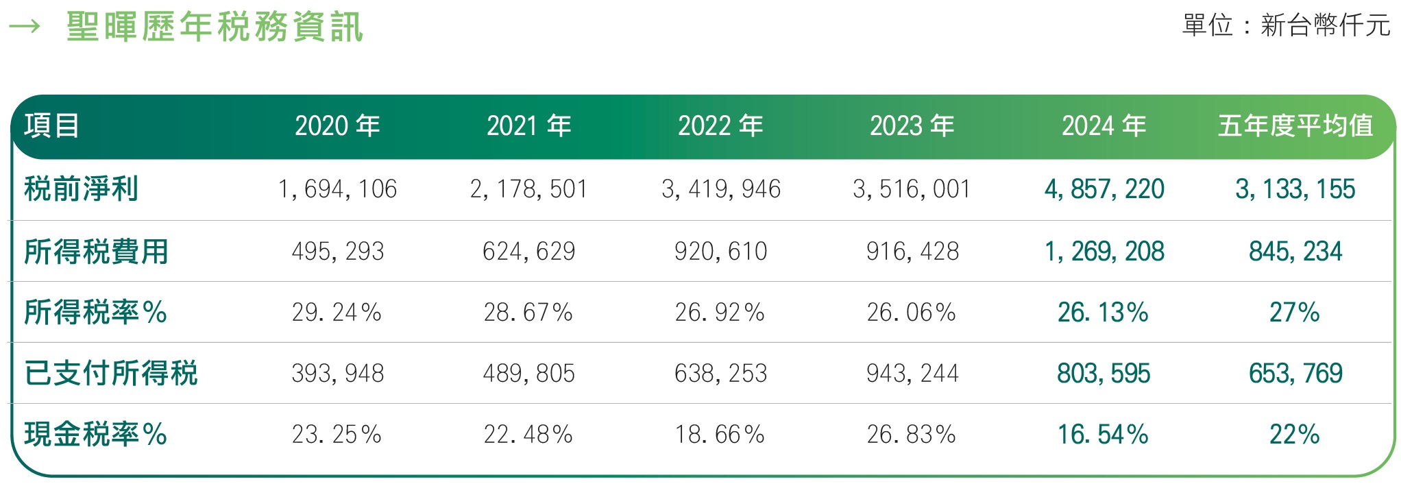 聖暉佈局全球業務,集團遵循營運所在國當地稅務法令及法規,以繳納合理稅賦回饋社會及經濟環境為己任,承諾不規避稅賦、拒絕非常規交易移轉利潤,避免集團營運績效產生不利影響。為有效管理稅務風險,聖暉辨識潛在稅務問題與評估可能發生之風險,並定期檢討工作執行成果。聖暉2024年度所得稅率為26.13%。